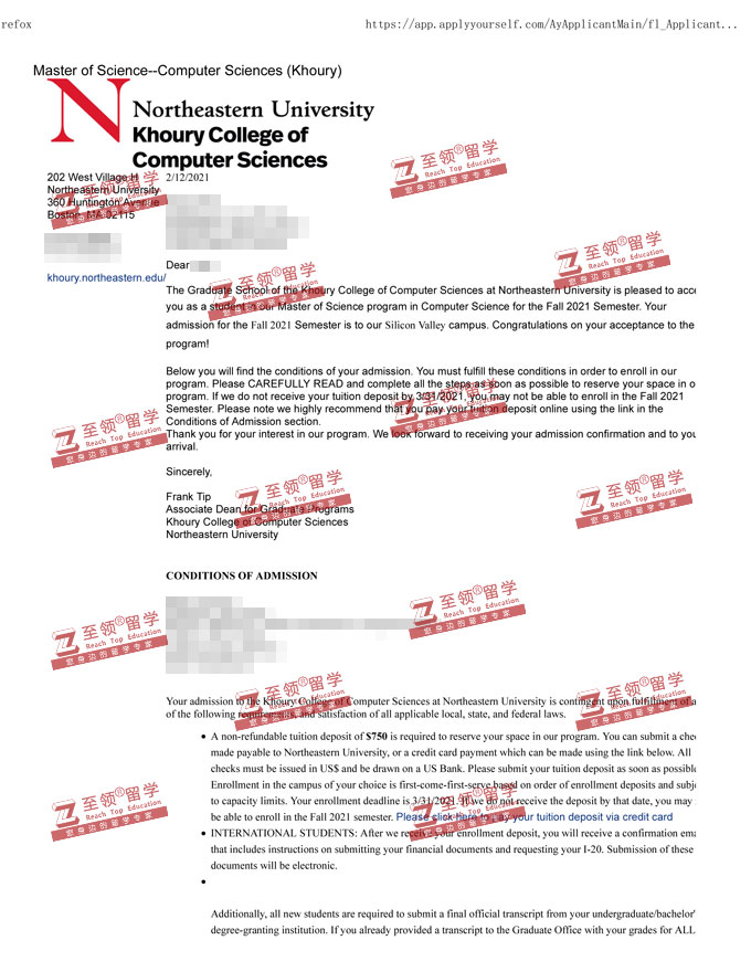 录取结果:NEU,MS in Computer Science美国东北大学计算机科学硕士录取