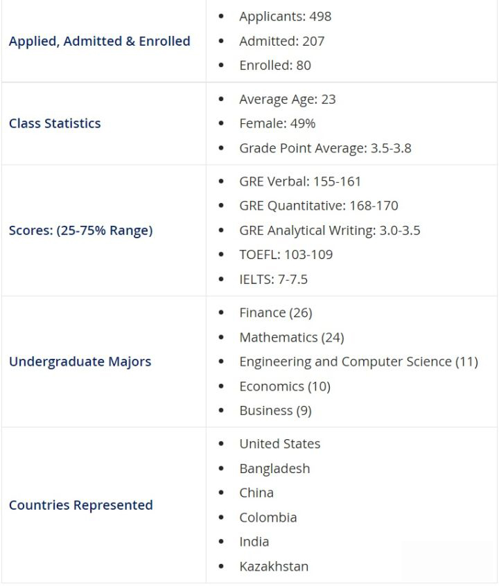 CS背景,10个Economics背景,9个Business背景。从申请数据来看,21秋一共只有498人申请,这跟美国热门同等级学校的金工金数项目例如哥大或芝加哥的金工金数相比,申请人数相对是非常少的,而差不多有小一半申请者(207人)能获得录取,不得不说录取率颇高。而虽然该项目开设在工程学院,但是明显最喜欢金融背景的学生,其次数学背景和工程背景,而像经济或商科背景也完全可以申请。