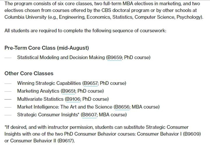 哥伦比亚大学的市场营销硕士开设在Columbia Business School下,项目时长2个学期(fall and spring) ,学生在校期间需要完成10门课程的学习,共计30学分。该硕士课程由5门核心课,2门MBA选修课,2门PhD选修及其他学院(如工程,经济,统计,计算机和心理学)选修课构成。