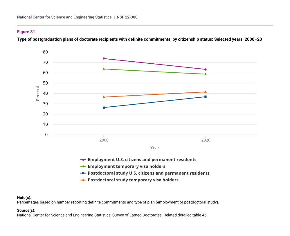 不管是国际生还是美国本土学生,在业界就职人数都多于博士后研究人数。