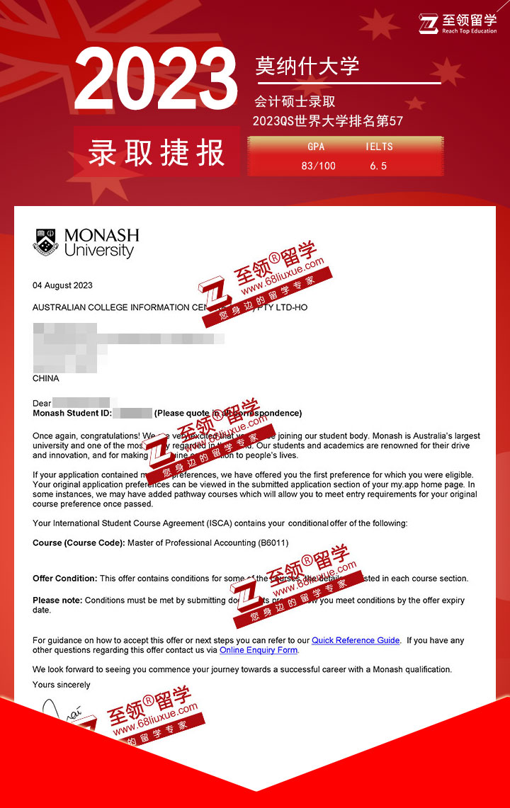 录取结果:Monash University,Master of Professional Accounting 莫纳什大学会计硕士录取
