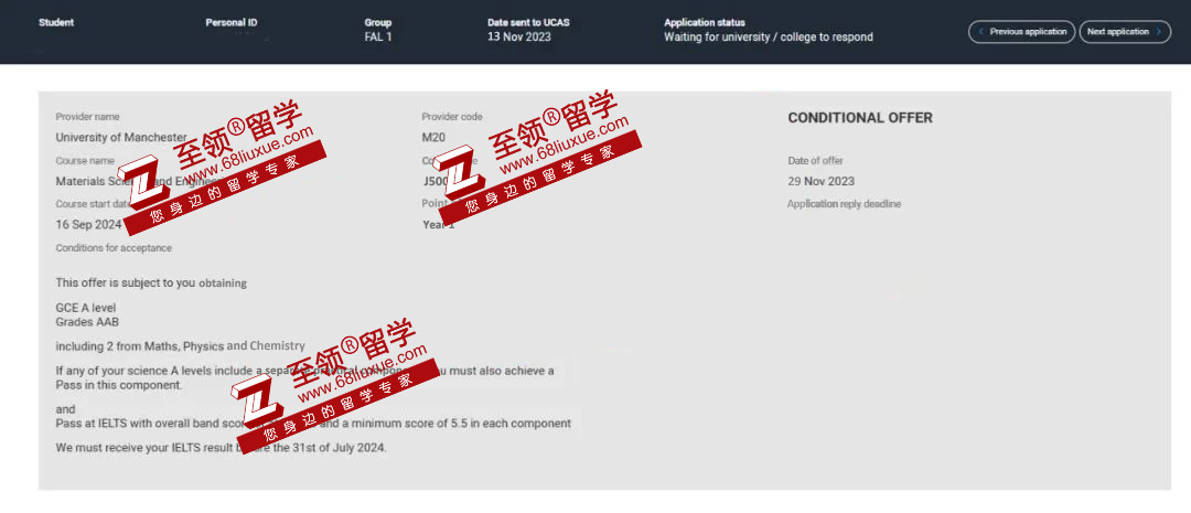 S同学硬件背景不错,通过上一届的学长介绍找到的我们,希望能够申请到英国名校本科。通过对S同学的全面评估,最终我们商定申请曼大、格拉斯哥大学、华威大学、伯明翰大学、南安普顿大学等5所院校。经过至领留学申请老师与学生的共同配合与努力,S同学顺利收获曼大录取。