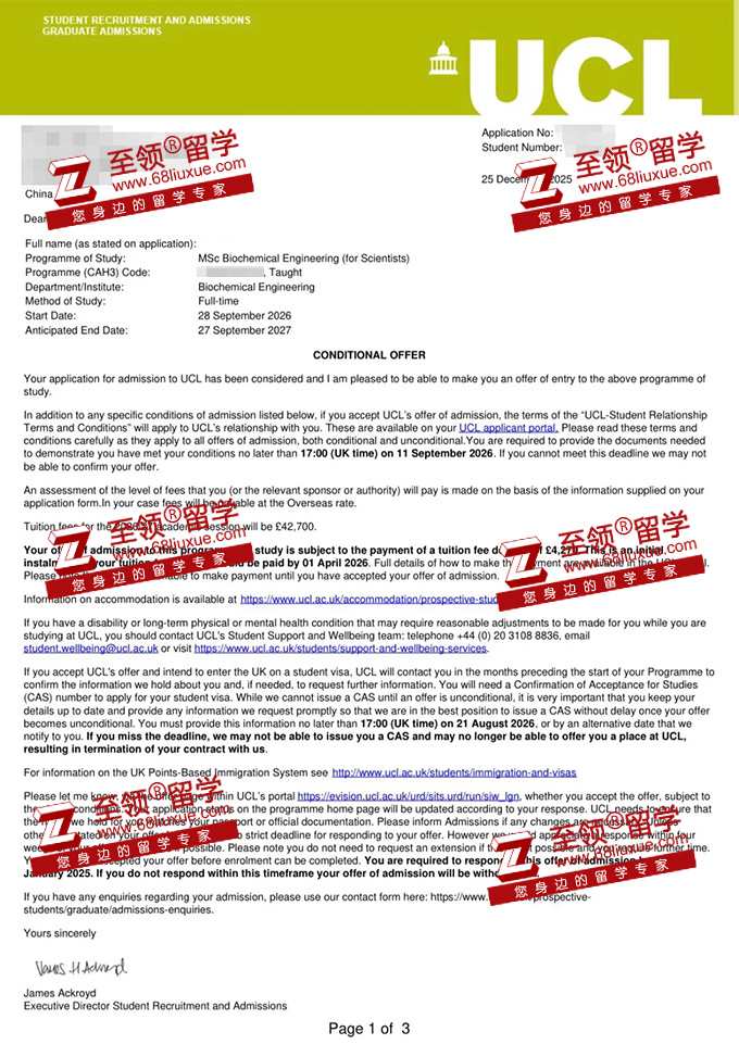 录取结果:伦敦大学学院生物化学工程硕士录取