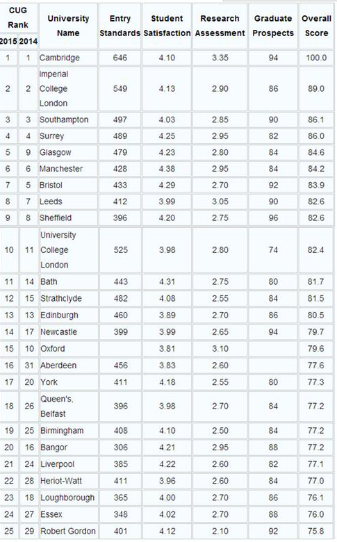 首先看一下2015年CUG 完全大学指南 电气与电子工程专业的排名情况。