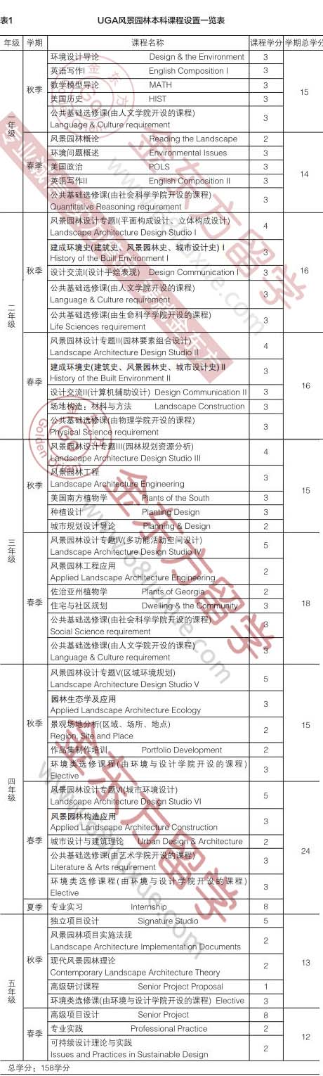 UGA景观设计专业本科教育学制5年,学生应在5年内完成国家规定的公共基础核心课程、景观设计理论及实践课程、暑期职业实践、毕业设计等环节学习,修满158学分(必修课120学分,选修课30学分,职业实践课8学分)方可毕业(表1)。课程设置乃教育之本。UGA景观设计专业本科课程设置别具匠心,特色鲜明,主要表现为门类多元化,知识系统化,科目务实化,目标优质化。
