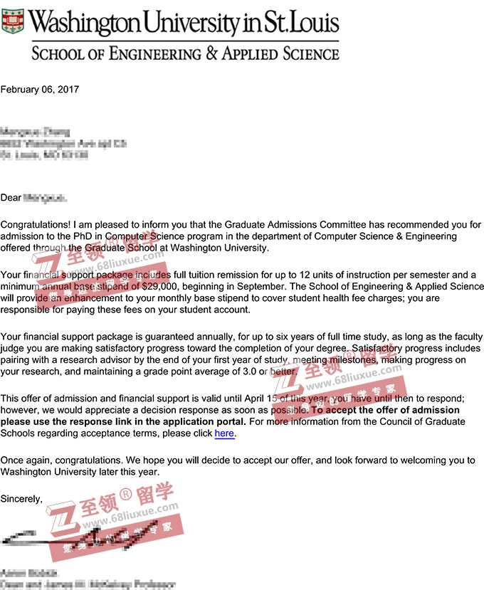 在提交了申请后,张同学在煎熬中等待着结果,我们提醒他排名靠前的大学不会太早出结果的,但是张同学还是显得有些焦虑。在一天天的等待中,同时收到了麻省大学和圣路易斯华盛顿大学计算机专业的录取,麻省大学答应给每年给$65527的奖学金,华盛顿大学每年$58000的奖学金。