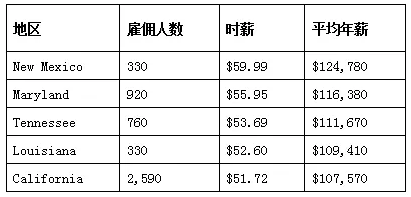 主要产业分布在飞机生产,建筑与工程,科研开发与半导体等产业。材料工程师需要使用CAD软件办公,少数情况也需要前往工工厂或者施工现场处理相关工作。以下是材料工程师在美国的行业招聘及待遇情况(来源自美国劳工部2018年5月数据):